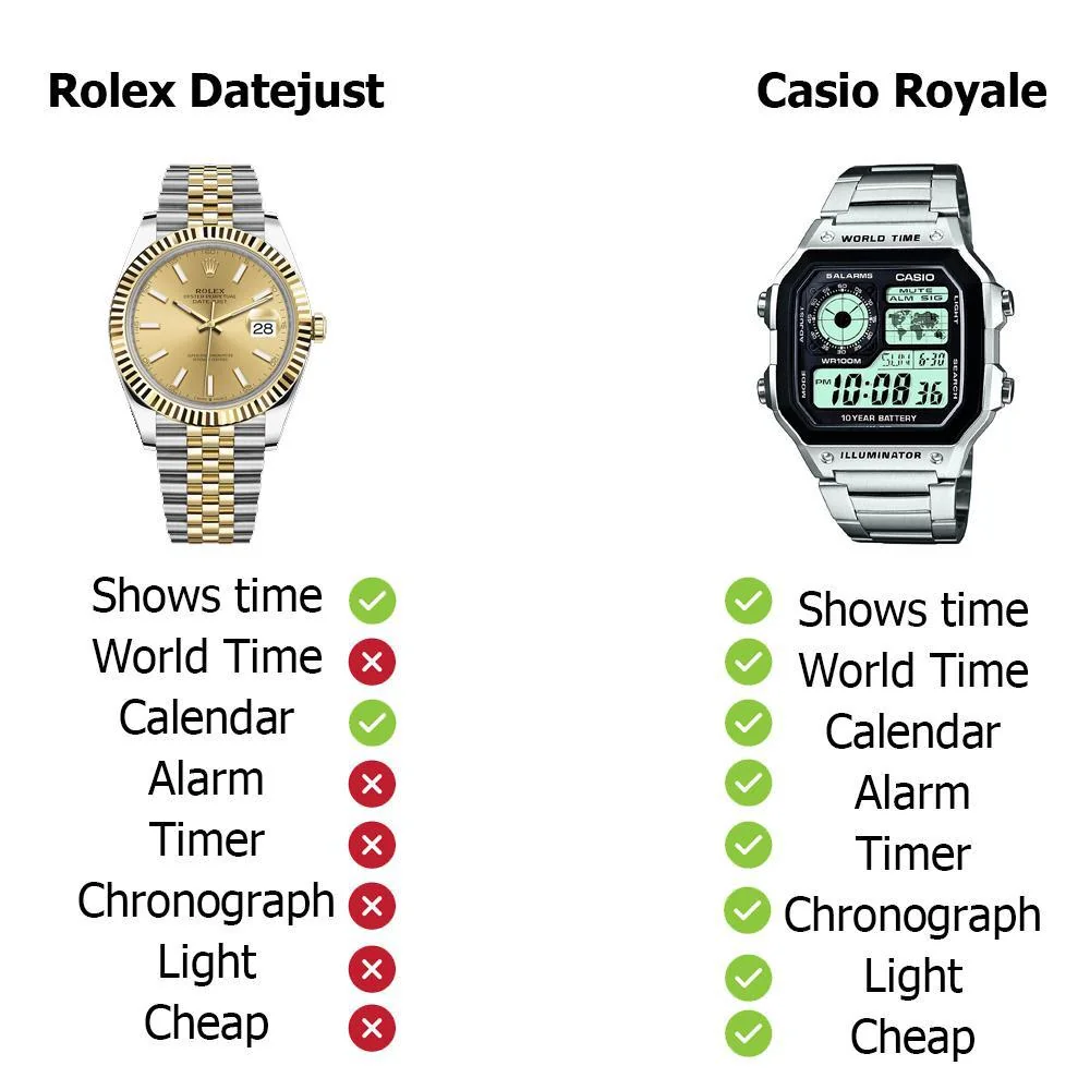>Что из этих двух настоящая вещь, а что сделано в стране с дешевой рабочей силой и не имеет ценности, понятно и так. Если тебе понятно то расскажи пожалуйста, очень любопытно. Начни, наверное, со сравнения технических характеристик "настоящая вещь" и недорогих касио.