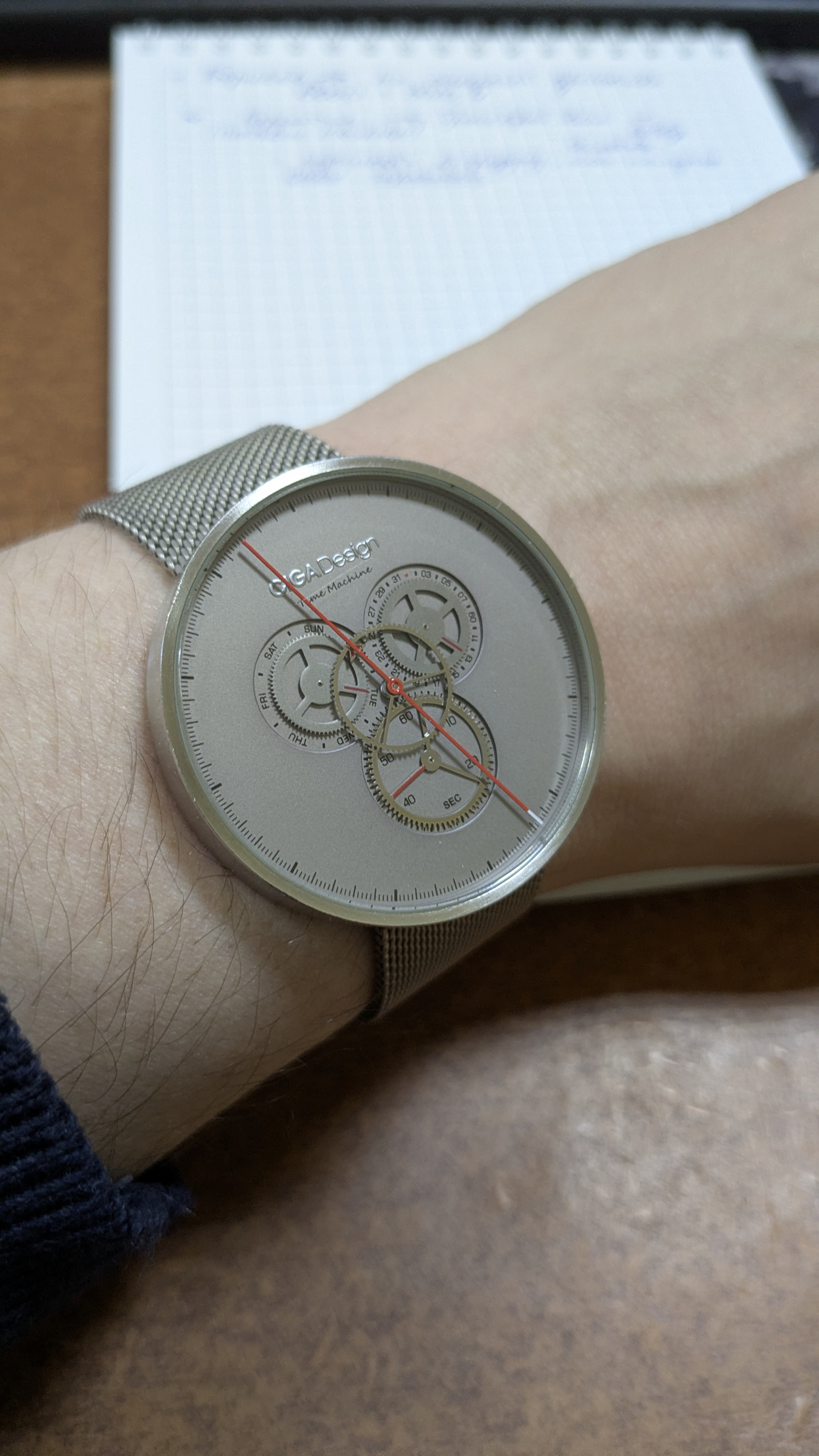 >>1964941 Нижняя шестерня - секунды Средняя шестерня - часовая. (На одном из радиальных лучей метка в виде "v", как раз неудачно прикрыта минутной на фото) Большая красная стрелка - минутная (белый кончик указывает с какой стороны)