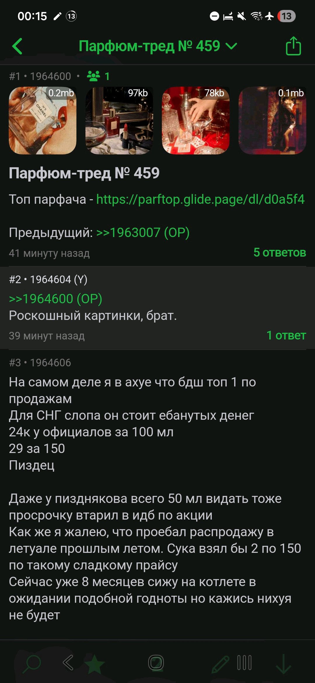 >>1964779 Никто не расценивает парфач как истину последней инстанции. Это не парфюмерный аналог гида Мишлен. Взглянув правде в глаза стоит признать что тут сидят сычи и обсасывают отливанты по 1,5 мл, выдумывая истории про то, как это чудо зелье будет покорять женские сердца. (меняется лишь объём отливантов). Никто абсолютно не знает про парфач, тут сидят "залётные", которым просто понравился парфюм.