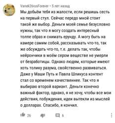 Смотрю я на Эвелину и вспоминаю свою молодость и схожие с этой рыжей примеры из моих наблюдений за другими. И думается только об одном. Почему среди тян такое часто бывает? Вот в подростковом возрасте они необычные, стараются как можно больше отличаться от остальных сверстников, не самые глупые, как минимум, умнее многих одноклассников, обладают самоиронией, могут подшутить над собой, имеют необычные для их возраста и половой принадлежности увлечения, вроде монтажа, советского антуража или чего-то такого, и увлечения действительно увлечения, а не хуйня для виду, с такими даже интересно разговаривать один на один или с друзьями, они много могут сказать и подъебать в случае чего. В общем, почти идеал, который нельзя не любить хоть чуточку. А потом проходит время, несколько лет, интересы меняются на жратву, фоточки и еблю, при этом чуть ли не в феминизм ударяются. Неужели гормоны так сильно меняют их? Потому что среди ребят я такой резкой деградации (не по причине наркотиков) не видел никогда. Почему так нахуй?