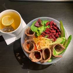 Попробовал повторить вьетнамское Бун Бо Ван Бо из того, что есть на кухне. Лапша, говяжий бекон, красная фасольочка, микс зелени, огурец, кетчуп, песто, орешки есть, но не стал, соевого соуса нет.