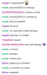 >>16204507 >А что с того что сосад сидел у жирманики? Да то что она бы давно его забанила и выкинула отовсюду, если бы это был реальный сталкер. Но она переписывается с ним уже который день, он ей что-то про котиков рассказывает, сидит вместе с ней на стримах жирманики. Кринжовый цирк.