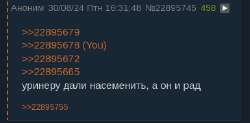 Откуда столько безреплайных дебсов повылазило? Это какая-то форма протеста, или вы не знаете как реплаить? На номер коммента жмёте и он вставляется в текст вот так: >>22894082
