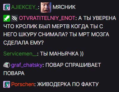 Гале нужно тему с кроликами ставить на поток, делать свой бизнес. Суть будет заключаться в том что симп заказывает блюдо из кролика, которое галя лично приготовит своими нежными ручками. Весь процесс от забива до доставки в духовку будет видеофиксирован, можно даже стримить, чтобы клиент насладился с какой заботой галя будет для него готовить. Развлечение не из дешевых конечно, но свой спрос найдет. В выигрыше будут все, семейство новоселовых получит деньги для расширения бизнеса, можно будет новую живность заводить, галя уталит жажду в убийствах, симп получит блюдо приготовленное его любимой и-герл. Только с доставкой хз как, чтобы не испортилось.