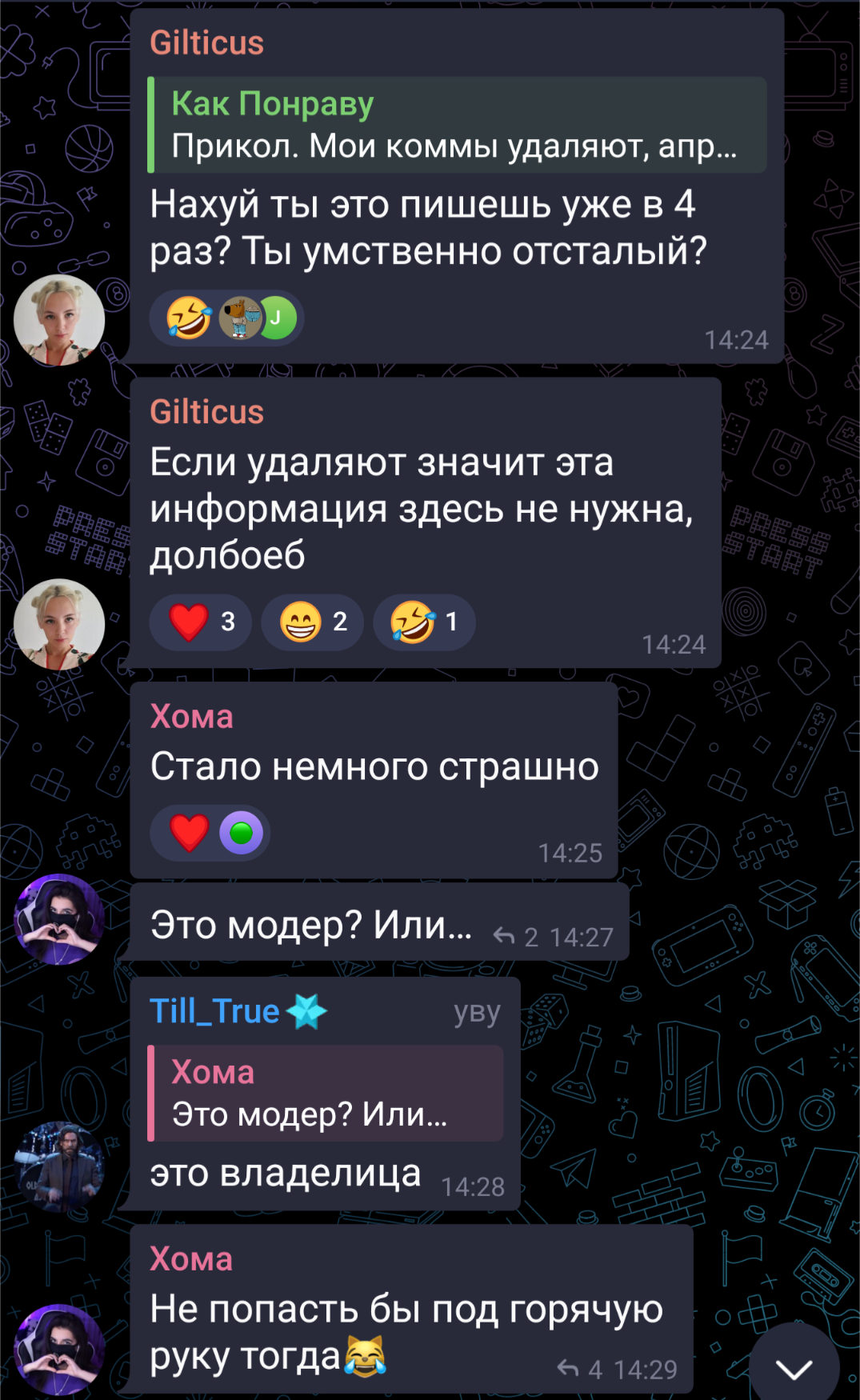 >>24704875 Я хочу одного что бы Жене было спокойней это раз, два что б этот тред удалили всё раньше мне об этом треде писали и я смеялась ну пишут и пишут а когда сама сюда зашла и увидела весь пиздец со сливами включая приватку это уже переходит все границы дозволенного. >>24704879 Женя не обязана перед своими сипмами отчитываться, особенно о личном, достаточно что вы про дачу слишком много узнали. Другие подробностей можете даже не ждать даже если самых ноющих придётся в мут отправить, придут другие. Достаточно что она с вами открыта на столько на сколько это позволяет ситуация это всё)