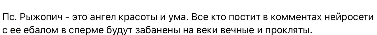 Рыжопич реально заебала. Она ничего из себя не представляет, только яркий клоунский внешний вид и не более того. А прошивка стандартная, нормисная. Нудл с цыгой хотя бы на нефоров похожи, ну и цыга точно фанат Илюки и посетитель подсостреда. Я не настаиваю что это хороший человек и всё такое, но уж точно получше рыжей пизды, которая из себя вообще ничего не представляет