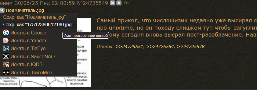 Мне крч седне ржака приснилаль что чмодьедаун залетухой оказался и не знает про юникстайм, он бегал по треду реплаил посты с юниксиаймом и вообще расследование провел, наскринил картинки себе в папочку и шизопост высрал что это все один человек, а когда над ним все уже посмеялись он еще несколько часов сидел копротивлялся, крч умора полная, вы бы видели.
