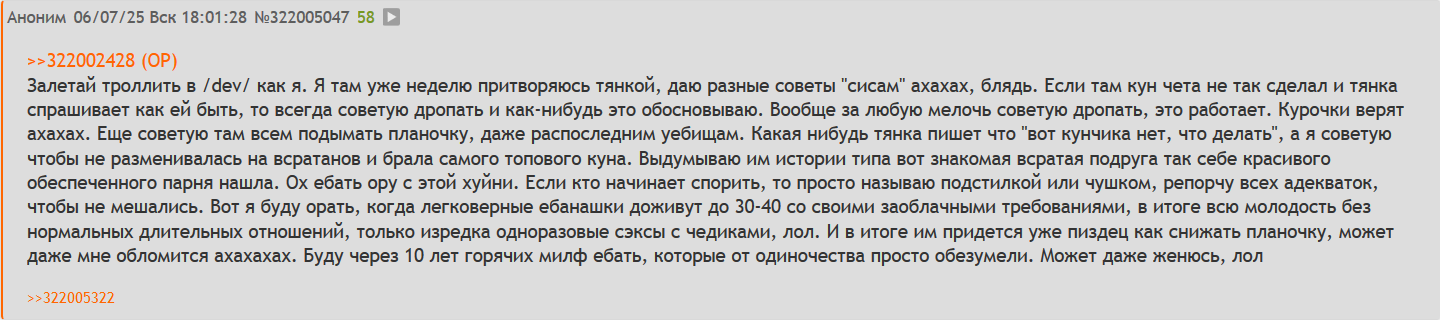 >>24760445 Ты мне напоминаешь того влюбленного, тупоголового кисика, который осознав, что тетя не его полета, самоубился в ее тг о модерацию задунйского пса и пришел ныть и срать в этот тред, ибо от любви до ненависти - один шаг. Буквально блять, риторика один в один, копиум во все поля.
