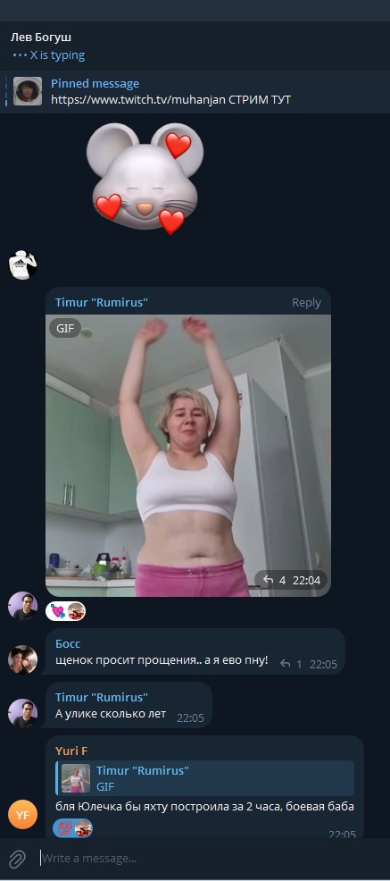 кстати может есть у кого кружки из тг этой жирной фемки сразу после начала тех самых событий 3 года назад? там он резко негативно высказывался про ситуацию и был против начала