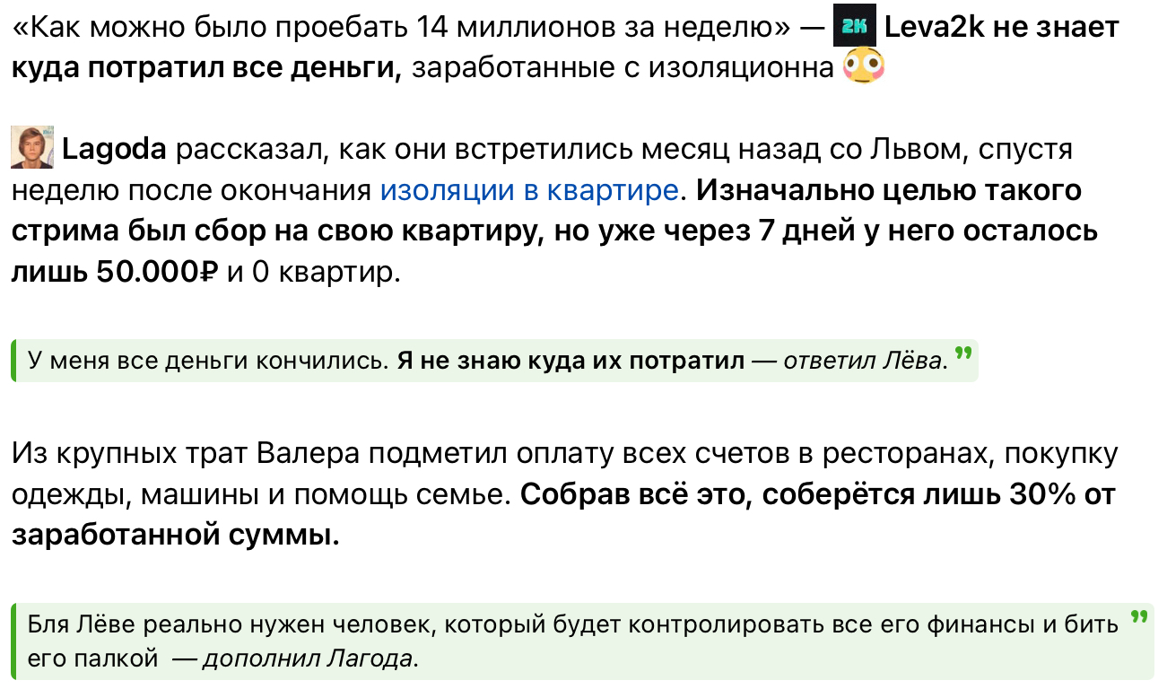 >>24896912 да сто процентов эти донаты муть полная. я про это писал еще во время самой изоляции. не бывает так, чтобы на протяжении месяца, поток донатов не менялся изо для в день, без просадок абсолютно. как минимум теряется интерес, как максимум найдется лишь 1-2 кукича, которые будут в агонии въебывать все свои бабки так долго, но у жопуша сменяемость донатеров как генератор случайных слов. но всегда было забавно с однотипного лампового доната, который задает темп и бугуртит гоев на большую выкачку. буквально донат в 20к с другого конца лайнера от пузбойса с безобидным и примитивным текстом на лот диванчика, чтобы разогнать говняк. там явно были самодонаты, перебивающие донаты и еще бородатая тема с отмывом, которая тянется еще с его первого тура