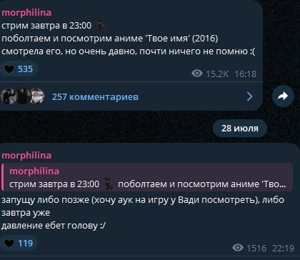 >>24901768 хз, но это было довольно странно, он отписался где-то 12-13 июля, а она через 2-3 дня, хотя у него ещё с начала июля был активный шип с морфилиной. ну типа какая причина отписки могла быть, если у него с другой девкой уже 2 недели активное общение