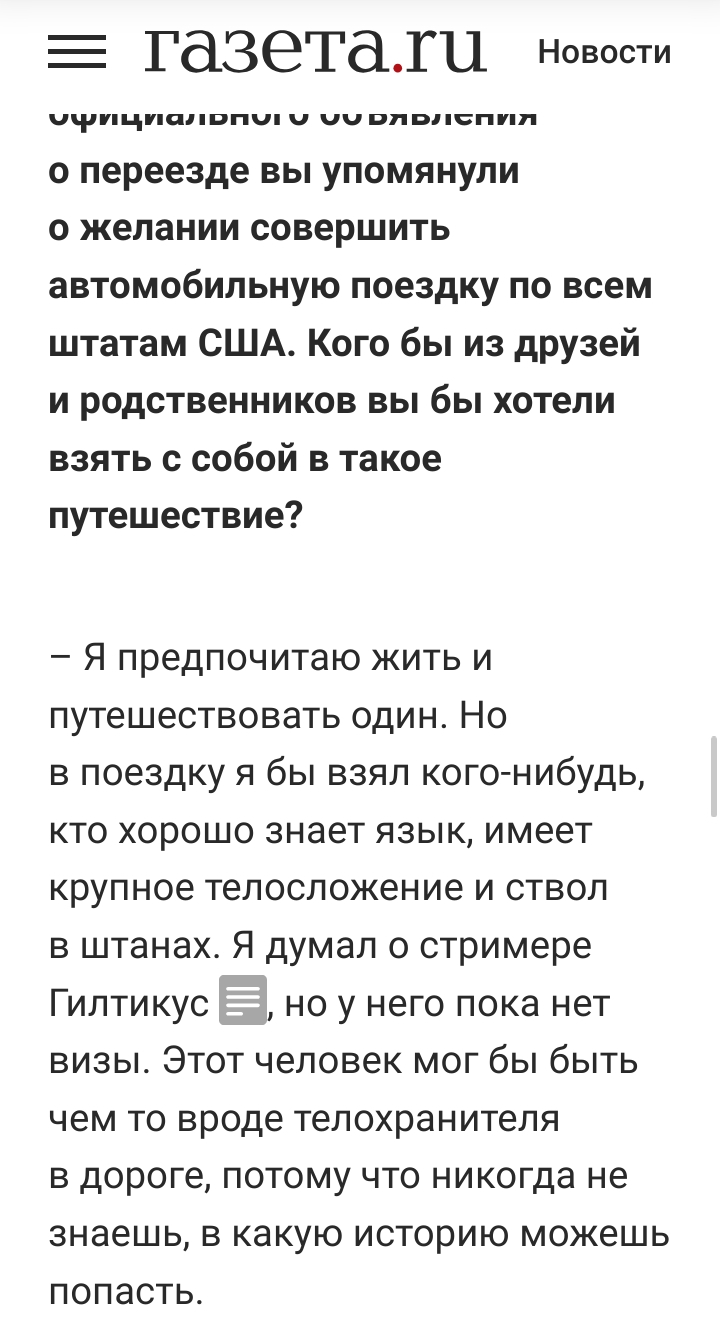 Гилтикус ненавидит Россию и русских, мечтает об её развале и независимости Башкирии, эти мысли не стесняясь транслирует на свою аудиторию, благодаря чему получает постоянные респекты от Марго и Алёши Губанова.
