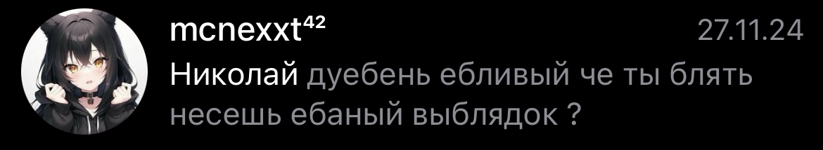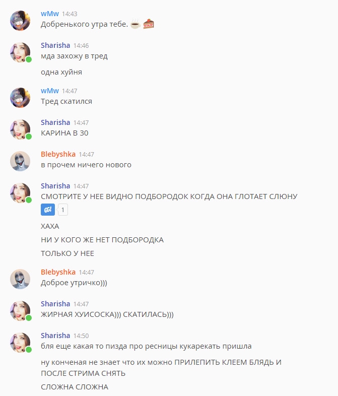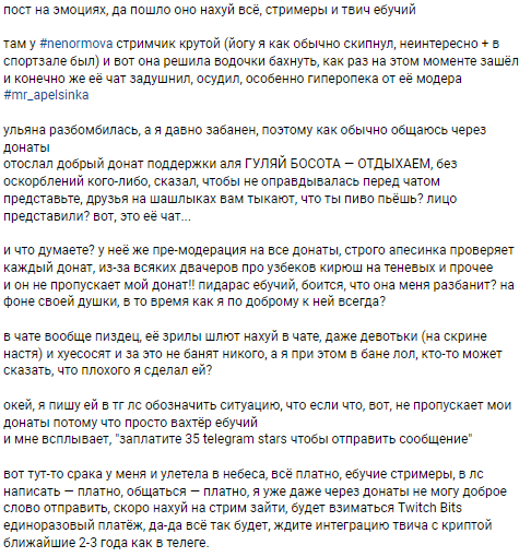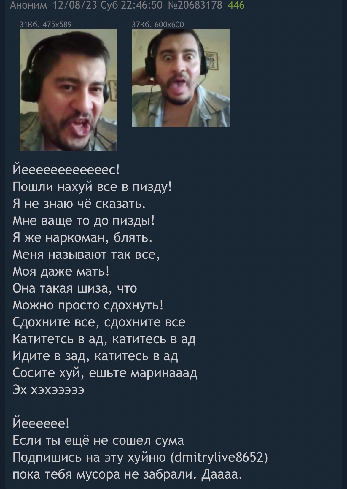 У додика пошла стадия агра, сначала про соседа орал как бы он его ножиком порезал или арматурой голову разбил за то, что тот приходил жаловаться что он шумит когда бухает. При этом сам же сказал, что промолчал когда тот приходил. Потом начал на габи гнать, такой хуйни про нее понаплел с оскорблениями. Такой еще говорит, что с него никто не сможет спросить. Типичная агрессивная алкохуета, которая упадет от пощечины.