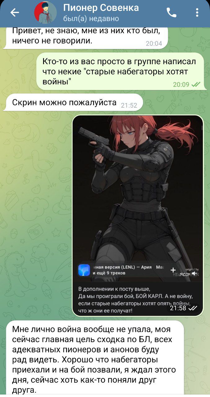 >>24827361 Лично я за. Совместный проект чтобы достичь большего понимания. Почему бы и нет? Главное чтобы никто не агрессировал ни с какой стороны. Давайте уже дружить а? >>24827497 И это тоже. Я понимаю что и с нашей стороны и с их стороны много зла было но бля. Не то чтобы я их полюбил но по факту Гербы единственные кто остались на плаву за городом ибо остальные фистуны заныкались по частным тусовкам и городским мероприятиям. Остались по факту только две группировки. Набег и они Гербы. Давайте уже как то договоримся. Давайте договариваться чтобы прийти к общему знаменателю