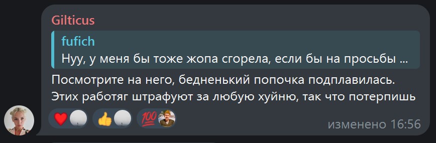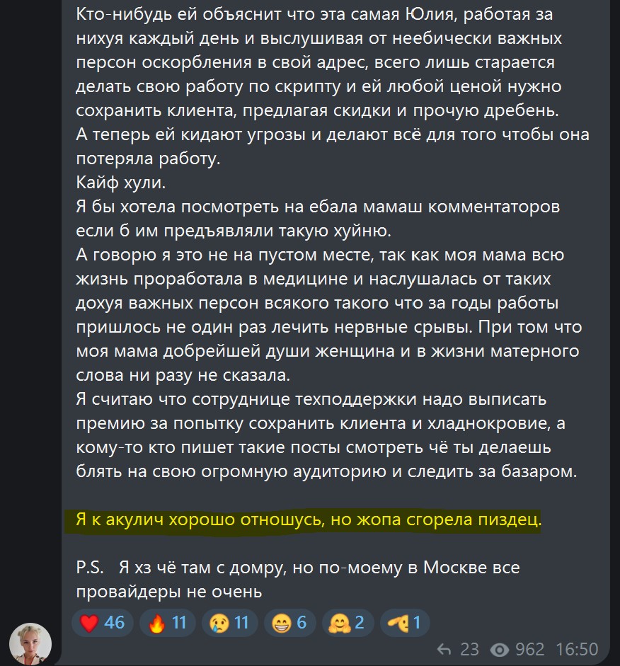 >>24922725 Тупая пизда (еще тупее Женечке, за что самой Женечке и нравится), начала выебываться в чатике провайдера, что ща пост в телегу напишет, на цельных триста тысяч! а после и вовсе на личности перешла