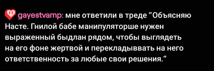>>24922106 Объясняю Насте. Гнилой бабе манипуляторше нужен выраженный быдлан рядом, чтобы выглядеть на его фоне жертвой и перекладыввать на него ответственность за любые свои решения.