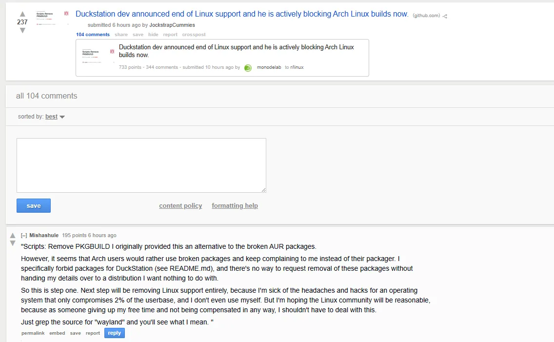 Из последней ссылки один пункт прямо про тебя слово в слово, лол: >7 - I never felt I was superior for using Linux, but most Linux users think they are. If you criticize the system, because you want it to get better, they think you are dumb, lazy or longing for Windows. For them, Linux is already perfect. Newcomers are only welcome if the bow down to Linux issues