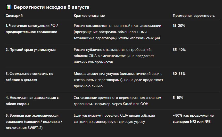 8 августа — ключевой рубеж: либо Россия соглашается на сделку и начинает деэскалацию, либо США вводят новые санкции, особенно в отношении стран, покупающих российскую нефть и газ.