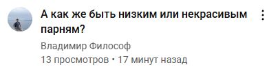 Был в ПВЗ Яндекса. Думал, там как обычно тяночка-зумерша сидит, а там в этот раз был зумер-приттик с дошираком на голове и в модных очках. Но я не так сильно расстроился, потому что ростом он был с меня, может даже чуть ниже - явно до 180см. Хотя и так ясно, что из-за смазливой внешки, он трахает зумерш пачками, не смотря на рост. А я девственник в 31 год.