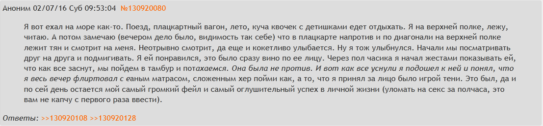 Какой же ад ехать на боковушке, брал в последний момент билет. Тут оказывается место под багаж тупо меньше чем в нормальных местах. Все время ходят рядом с тобой всем вагоном о ужас. Еще весь вагон в лагерных подростках. Им вожатые постоянно чето носят, девки рядом обсуждают с какими чедами танцевали на дискотеке. Мрак. Но ниче потерплю, надо немножко потерпеть просто, и всё будет ага. 🦥