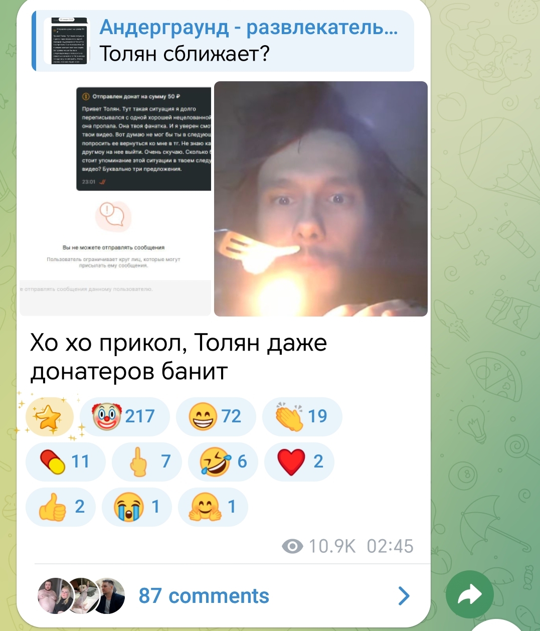 >>24957703 Эта неделя меня прямо морально растоптала. Сначала пост в треде про Каррамбейби, где она обвиняет Славу Мэрлоу в абьюзе, хотя до этого говорила, что расстались друзьями. Потом Ненормова, которая после 5 минут переписки с Мэддисоном, который ей никто, не парень, не муж, отправила ему фотку своей жопы. Потом эта слитая переписка Санечки про "обезжиревание". И финальный аккорд - сегодняшний стрим-свидание Гилтикуса с этим богатым зумером, где она смотрела на него влюблёнными глазами из-за того, что он такой богатый и популярный. Я не пидор, конечно, но всё равно меня это задело.