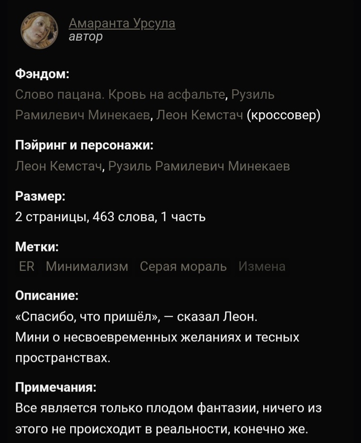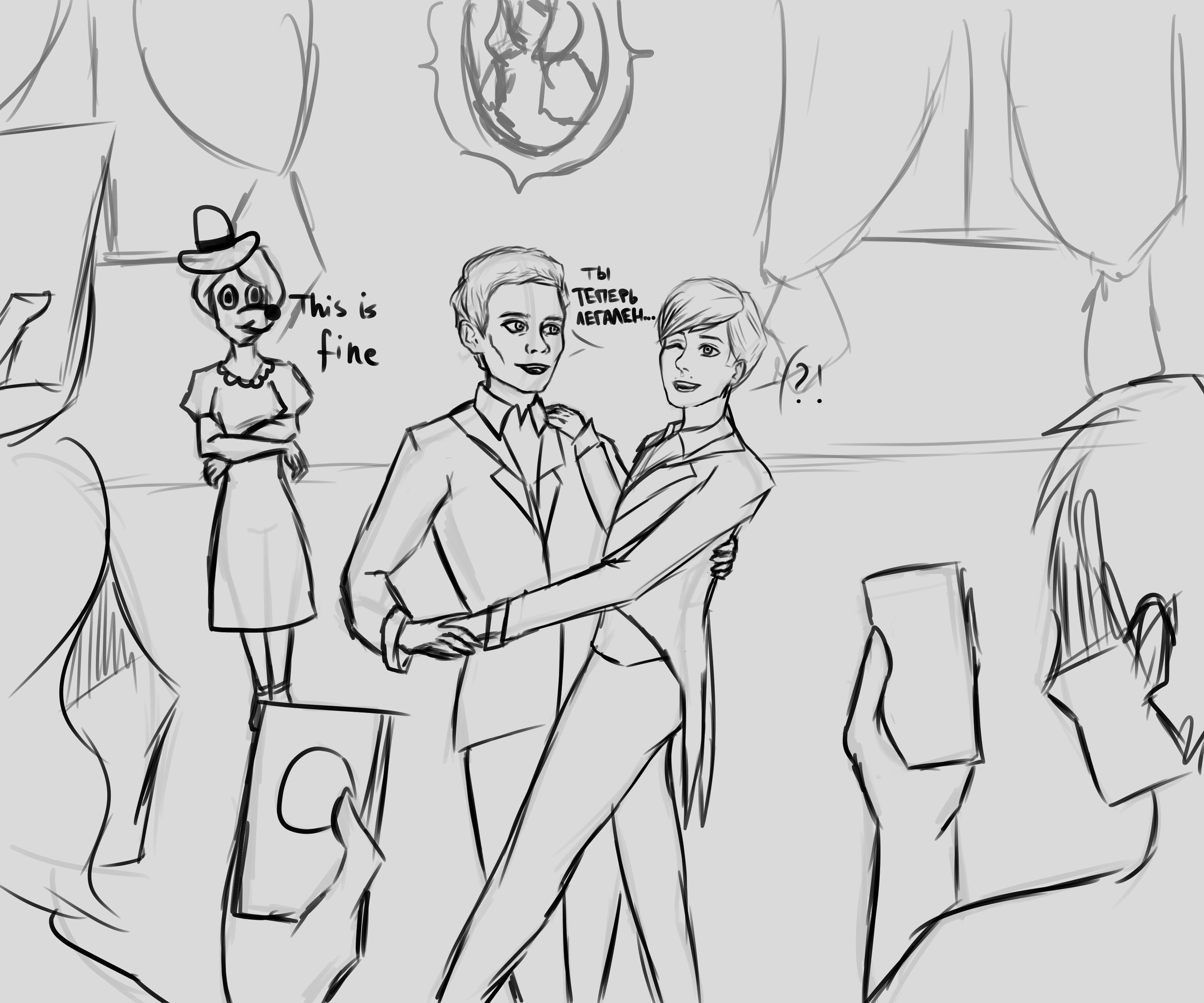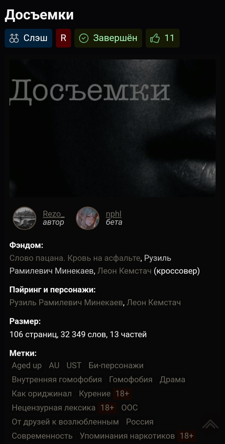 — Что это у тебя? — спросил Леон, дотрагиваясь до лица Рузиля и вытирая каплю чего-то тёмного с его губы прохладными подушечками пальцев. — Да, наверное, с торта, — Рузиль перехватил его руку, и словно колеблясь, чуть дольше задержал прикосновение, чем следовало бы. Мягко отпустил. — Сироп, — сказал он, пряча глаза и глядя куда-то вбок. Дверь в туалет резко распахнулась. Леон и Рузиль одновременно посмотрели каждый в своё зеркало. Ледяная вода свела пальцы Рузиля, они онемели и побелели. Родственник Леона отвернулся к писсуару, затем вымыл руки и вышел, косясь на них. Леон снова повернулся к нему: — Спасибо… что нашёл время и пришёл. — Да… вообще повезло, прикинь? Смена должна была быть до полуночи, но как-то какие-то перестановки сделали… — незачем Леону знать, сколько дней до этого он ходил между режиссёром и оператором, пересогласовывая один-единственный вечер съёмок. Дверь снова с силой распахнулась. — Леон, ну где ты там? — тот, кого звали Феликсом, ввалился в туалет. — Ща! Феликс, бренча браслетами, увальнем, с пьяным грохотом открыл дверь туалета и скрылся. Шум воды в раковине. Рузиль взглянул на Леона сквозь зеркало. — Мы сейчас уже поедем… Рэму спать надо. — Ага… Дверь туалета со скрипом шлёпнулась о стену. Развалистой походкой Феликс подошёл к раковине, начал нервно потирать нос, ухмыляясь своему отражению. Он похлопал Леона по плечу: — Феликс, блять. Там мама моя… — Да лан, чё ты… Давай двигай туда. Ща будет Кадышева — Милана хочет с тобой спеть. А то позвал девчонку, а весь вечер с ней сижу я… — Я щас. Ага. Дверь за Феликсом захлопнулась. Рузиль выключил воду и направился к выходу. — Руз… — Леон схватил его за локоть. — Подожди… у тебя ещё тут вот. — Мягкие пальцы заелозили по подбородку Рузиля. — Да чё ты делаешь… — только успел он сдавленно произнести, как уже вталкивал Леона в свободную кабинку. Леон уже обвил его руками. Рузиль одним движением руки запер кабинку и прижал его к дребезжащей двери. — Весь вечер… я не мог… гости… я так рад… что ты… — Леон говорил сбивчиво, зарывая руки в волосы Рузиля. Рузиль расстегнул рубашку Леона и спускался с губ к его груди. — Ммммгм… Телефон в кармане Рузиля коротко протрещал сообщением. Он потянулся за ним, но тот выскользнул из руки и упал на пол. — Блядь. Такси приехало. Думал, что Азиза вызовет позже… Что-то промелькнуло в воздухе. Взгляд Леона потемнел на мгновение, пока он застёгивал мелкие белые пуговицы. Рузиль заметил, как его пальцы дрожат и путаются, отодвинул его руку и застегнул сам, не глядя, в последний раз целуя его — перед тем, как выйти. Такси подъехало к выходу ресторана. Китайская чёрная машина. Азиза уже прикрепила Рэма и села на переднее сиденье, уткнувшись в телефон. Леон стоял в дверях, будто и не было ничего в кабинке туалета. После обязательных по программе дежурных улыбок и обещаний приглашать друг друга в гости и сходить на совместный пикник, Рузиль уже почти сел в машину, когда бросил короткий взгляд на третью сверху не застёгнутую пуговицу.