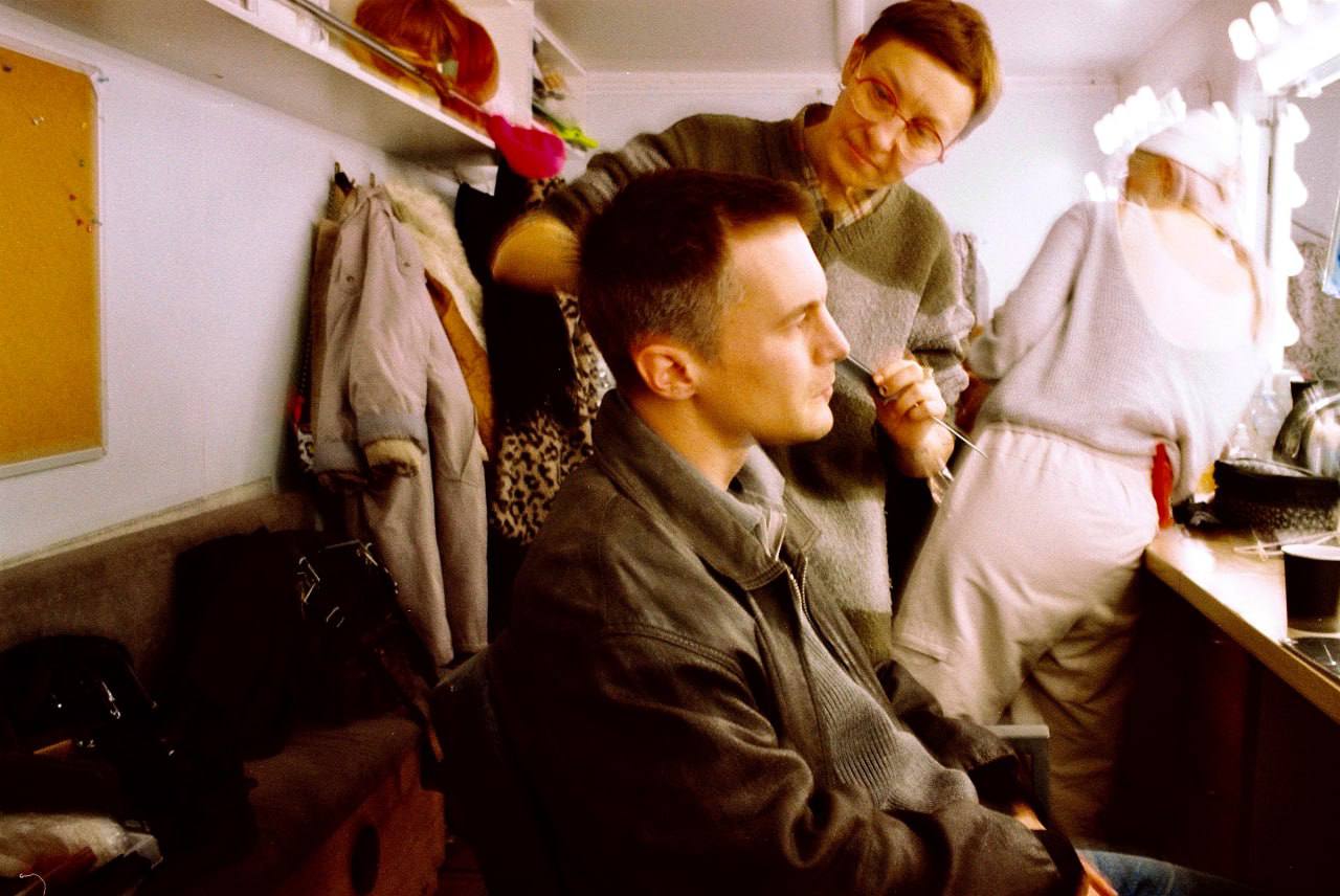 Рубашка помятая, как из жопы! Это все из-за того что снова приезжал Леончик на съемки и они с ним опять в вагончике кувыркались на глазах у всех актёров и вещи поскидали как попало, а потом пришлось в них же и сниматься и вот результат: