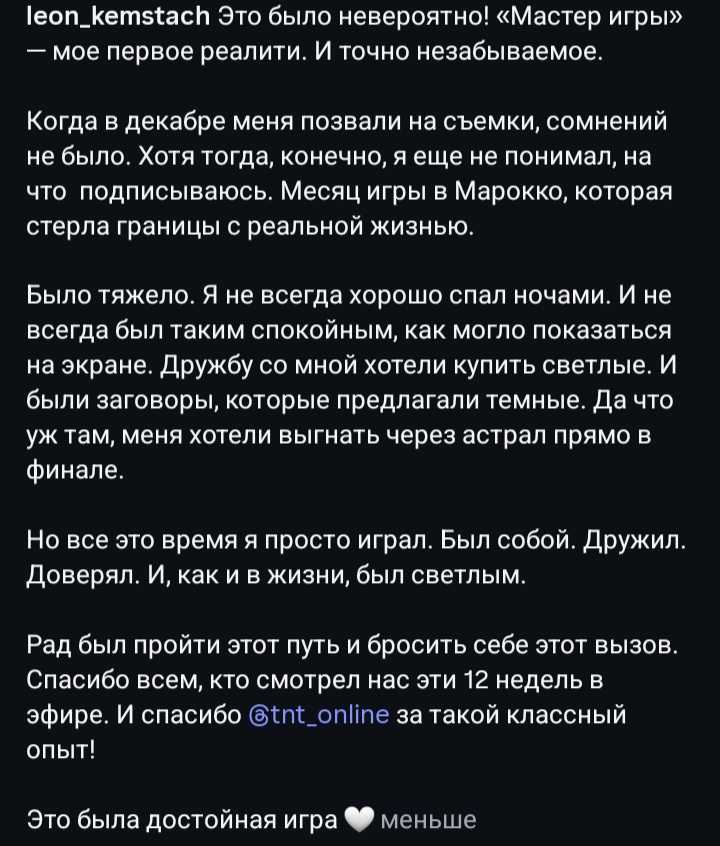 На телеканале ТНТ подходит к финалу психологическое реалити-шоу «Мастер игры». На протяжении нескольких месяцев 22 звёздных участника жили на вилле в Марокко в мире интриг, манипуляций и обмана. Всё ради приза в 10 миллионов рублей. Одним из участников проекта стал молодой актёр и певец Леон Кемстач. Мы поговорили с Леоном о его тактике в «Мастере игры», дружбе после проекта, ролях мечты, новых проектах и о личной жизни.