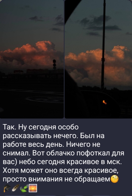 Очнулся нах! Верим пиздаболу??? Или нет? >Был весь день на работе, нечего рассказать Ага, весь день поди насаживал Камшотика в вагончике и теперь выдаёт это якобы за свою работу в тайне, а по факту нихуя не снял, чтобы не спалиться с ним лишний раз! Конечно закаты красивые и только их заметил, ибо с узбеком все закаты черные и жизнь в чб, а когда поебался там хорошо на съемках и теперь у него все красивое вдруг стало после Леончика...