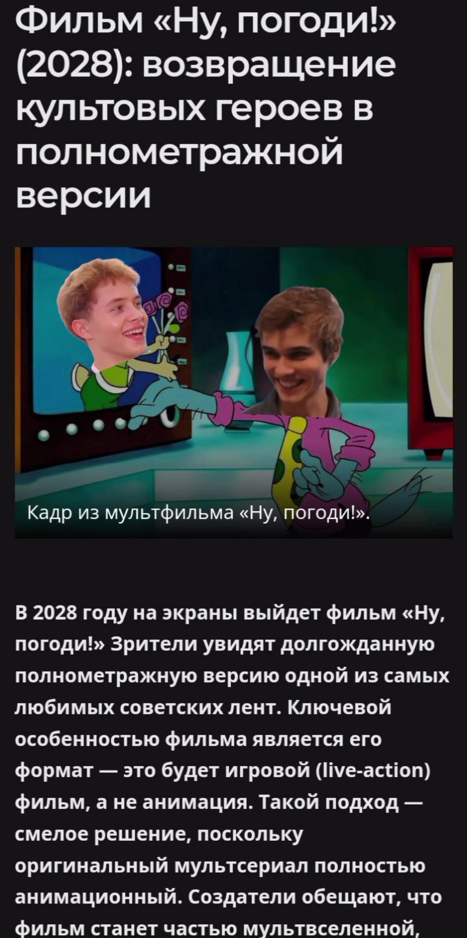 Давайте усиленно помолимся вместе всем тредиком, чтобы Минетачевы играли в главных ролях на Ну, погоди? Лучше ведь сюжета для них не придумаешь в этих условиях... Раньше же это как-то помогло намолить новый контент и их встречу на днюхе и даже поездку в Дубай (что казалось неосуществимо в этой вселенной) 🙏🙏🙏