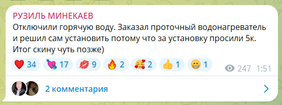 Отключили горячую воду. Заказал проточный водонагреватель и решил сам установить потому что за установку просили 5к. Итог скину чуть позже)