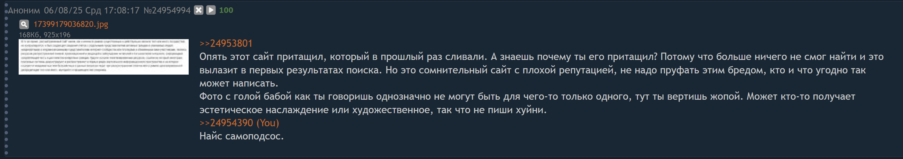 >>24953801 Опять этот сайт притащил, который в прошлый раз сливали. А знаешь почему ты его притащил? Потому что больше ничего не смог найти и это вылазит в первых результатах поиска. Но это сомнительный сайт с плохой репутацией, не надо пруфать этим бредом, кто и что угодно так может написать. Фото с голой бабой как ты говоришь однозначно не могут быть для чего-то только одного, тут ты вертишь жопой. Может кто-то получает эстетическое наслаждение или художественное, так что не пиши хуйни. >>24954390 Найс самоподсос.