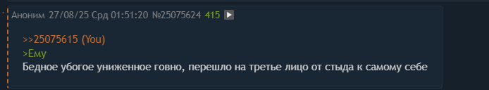 >Еще забавляет что он все время отсылает ко "всем", лишь бы они как-то ему помогли в его борьбе предыдущий пост дегенерата - >>25075203 мочехлёб настолько отупел что сам себя протыкает уже орейро