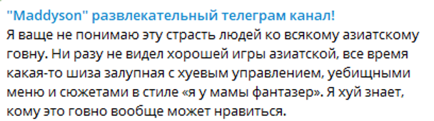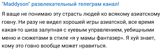 Мэд умный человек. Ему и фир хангер понравилась. Да это не его жанр, не его стиль игры, вообще он не может в нее поиграть сам, но он признаёт, что да это что-то необычное и интересное, да годнота. Точно также он признал и эвил визин, в то время как засирал все резики за каловое управление. А эвил визин это как раз духовный наследник резика с нормальным управлением и более интересным новым миром.