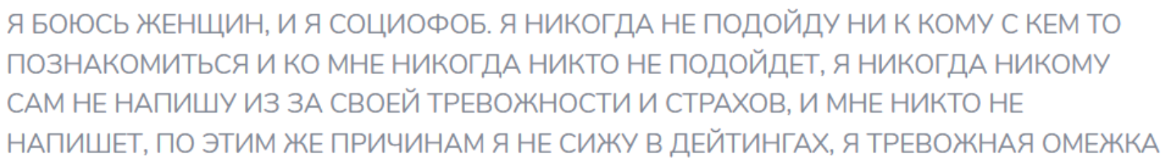 >>25077567 >Настороженность, тревожность, страх улицы, проблемы с памятью, регресс, если нихуя не делать в течение месяца, суицидальные навязчивые мысли