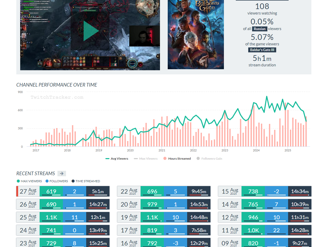 >>25080592 > че за бред, невозможно доказать что накручивает стример следовательно за это не может быть наказания Человек 12 лет стабильно подрубает в 11 часов по МСК на 3 часа стабильно с онлайном 3-5к человек. При этом его ресурсы вне твитча становяться все мертвее и мертвее из года в год