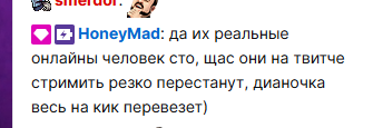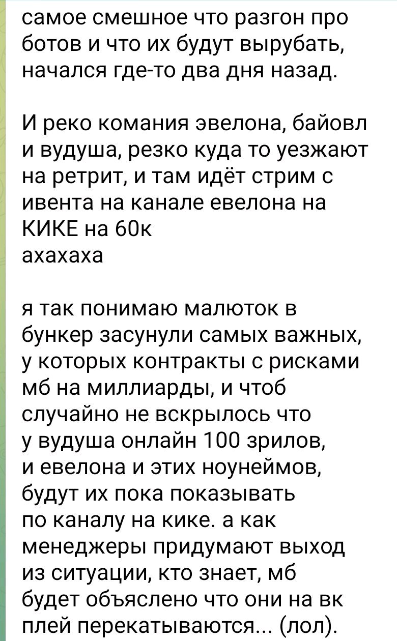 Ок хорошо. Жопич был прав насчет Дианы и ее агентства, которое крутит ботов. С этим никто и не спорил никогда здесь, наоборот. Он большую часть инфы с треда брал и добавлял к своим инсайдам. Но давайте о другом. Кто, помимо бустероэвелонов, убежал на кик и сидит стримит на 10-17к бурмалду? Кто стримил на твиче как пердит на калофеч с сосаней и это смотрело 33к? Вы бля верите в его онлайн? Он уже давно и сам смеётся на эту тему и постранично говорит "да, кручу тхитхи" буквально также как все стримеры обыгрывали тоже сводя все в иронию только что. Но в их случае они долбаебы, а в его "ахаха илюха мэд хорош" А ща заявляет что подрубит стрим на твиче и покажет как у него нет ботов. Первое. Почему сразу не подрубил? Зассал же Второе. Боты ботам рознь, андерсон ща закупает те к стриму на твиче, которые еще не ебнули И как пруф, что он рил крутит, это сообщения в чате на кике советами по игре, которую он проходил вчера. Забыли пасту обновить, которая прописана ботам. И так уже палились не раз.