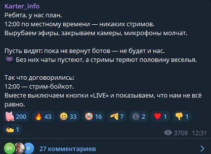 Поэтому, когда все зрители вернулись в прешнее состояние, количество людей, я удалил эти сообщения, потому что, ну, мне окончательно стало казаться, что к ботам от отношений вообще никакого не имеет. Более того, я обратил внимание, что у стримеров, которых я подозревал, прямо на Крутке, у них онлайн примерно таким же остался, то есть, как было там, к примеру, ну, две тысячи, да, так столько примерно и осталось. А вот у тех, на которых я даже подумать не мог, у них реально просватка была там в два раза, к примеру.