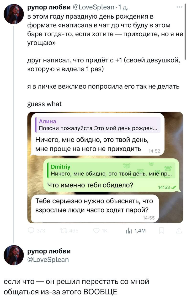 ну я бы все равно пришел с тянкой сказал бы типа "с др" и дальше в другом конце бара продолжил бы бухать с бабой, хули мне марамойка указывать еще чето будет 1)не звала 2)поляну не накрывала 3)соси хуй, я не к тебе пришел ,я просто в бар пришел
