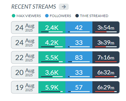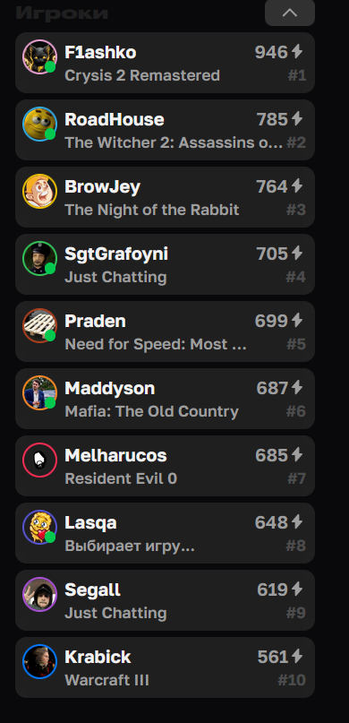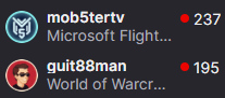 >>25089932 А ты сам думаешь для чего челу с 10 онлайна крутить себе? Чтобы хоть немного быть выше в общем списке русскоязычных стримеров. Чем больше цифра - тем больше шанс что к тебе зайдет случайный живой человек
