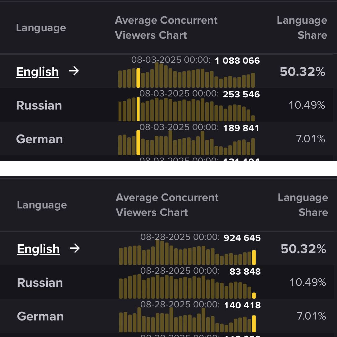 >>25093665 да это я понял, но чтобы немцы в 2раза больше смотрели после "открутки" твич это какой-то бредик, с учетом разницы населения только в России. А на русском все снг стримит\смотрит, кроме хохлов некоторых.