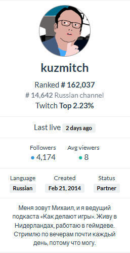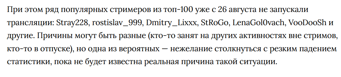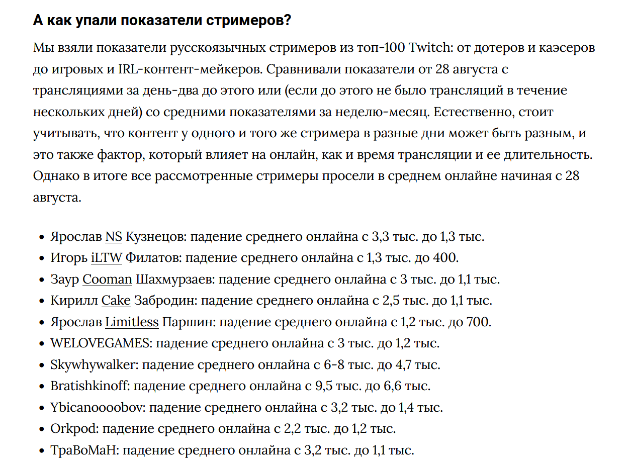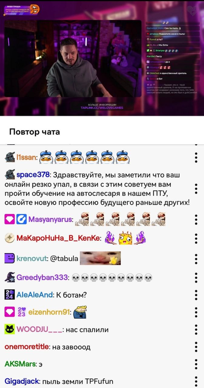 Забавно что как пруф ботоводства кидают высер ресентиментного ДТФера. Понять можно, в бородатых годах стримил на сотку, в подписчиках Юзя, Джус, ОляВуду, а сейчас восемь калек смотрят. Еще почему-то все связывают с твитом твич сапорта месячной давности, а не к штрафу РКН в 60 лямов, который был за день до, закону о приземлении, где надо иметь офис в РФ если 500к активных юзер, теневого бана 1080p качества и т.д https://dtf.ru/life/3993880-russkij-segment-twitch-nakrutka