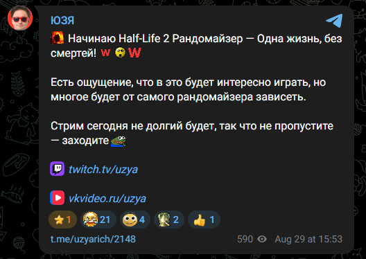 НЕ ЗАБЫВАЙТЕ ДЕЛАТЬ КЛИПЫ и коротко пересказывать что происходит на стримах которые вы смотрите! Потому что я не захожу на стримы что бы не прибавлялось зрителей у них! И вам советую.