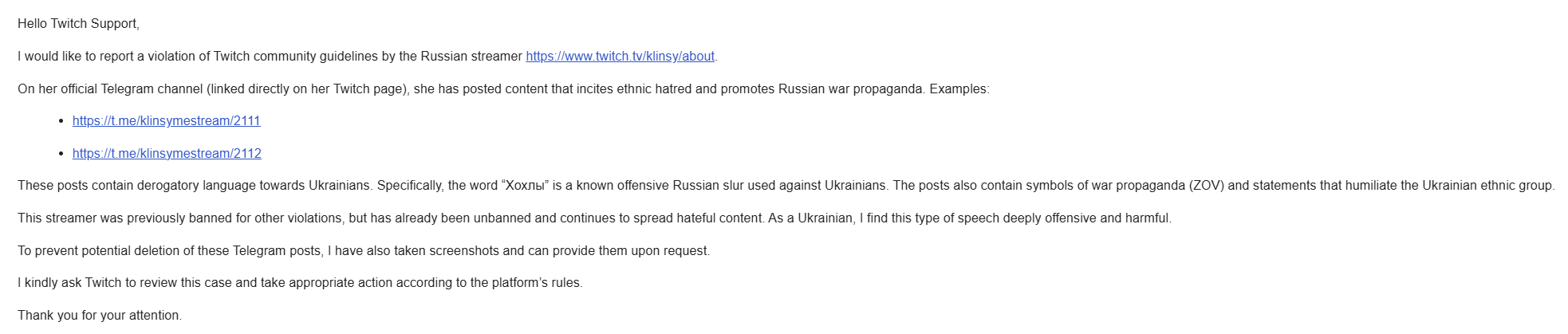 >>25093677 Была, но мне на такое письмецо сказали, что это не наша забота и жалобу не приняли. Там другой свод правил о поведении за пределами. Мб хуево расписал.
