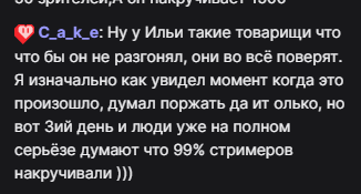 Бровян годами учил свой чат жить честно и по понятиям, а чепуха итт меня пытается убедить, что он все время пиздаболил и крутил ботов х8, относительно своих реальных 160 зрителей.