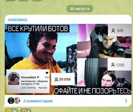 я всегда замечал, что у "обычных" стримеров накрутка ну процентов 20 была, чисто чтобы не отставать от трендов и показать рост, но когда порезали зрилов в 2-3 раза, я просто хохотал от этой хуйни