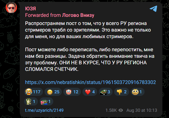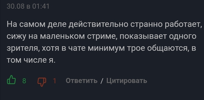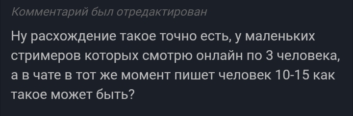 Всем понятно, что новый алгоритм отсеивает ботов, но при этом и некоторое количество реальных зрителей. То, что у мелкостримера на счётчике 5 человек, а в чате 6 не меняет того факта, что все эти мудаки накручивали себе х5-х10.