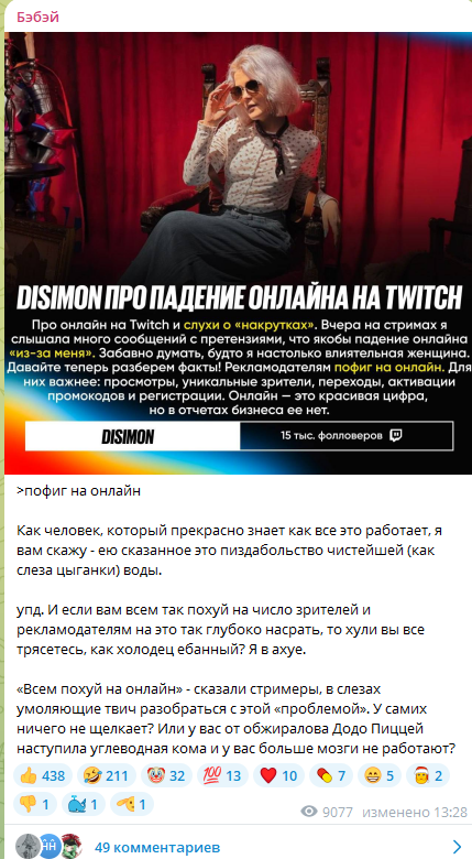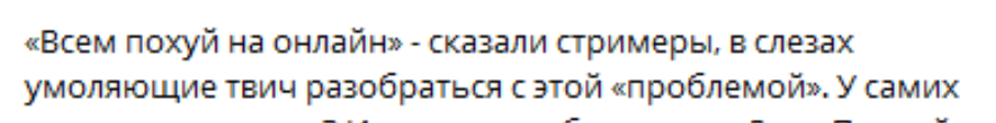 «Всем похуй на онлайн» - сказали стримеры, в слезах умоляющие твич разобраться с этой «проблемой». У самих ничего не щелкает? Или у вас от обжиралова Додо Пиццей наступила углеводная кома и у вас больше мозги не работают?