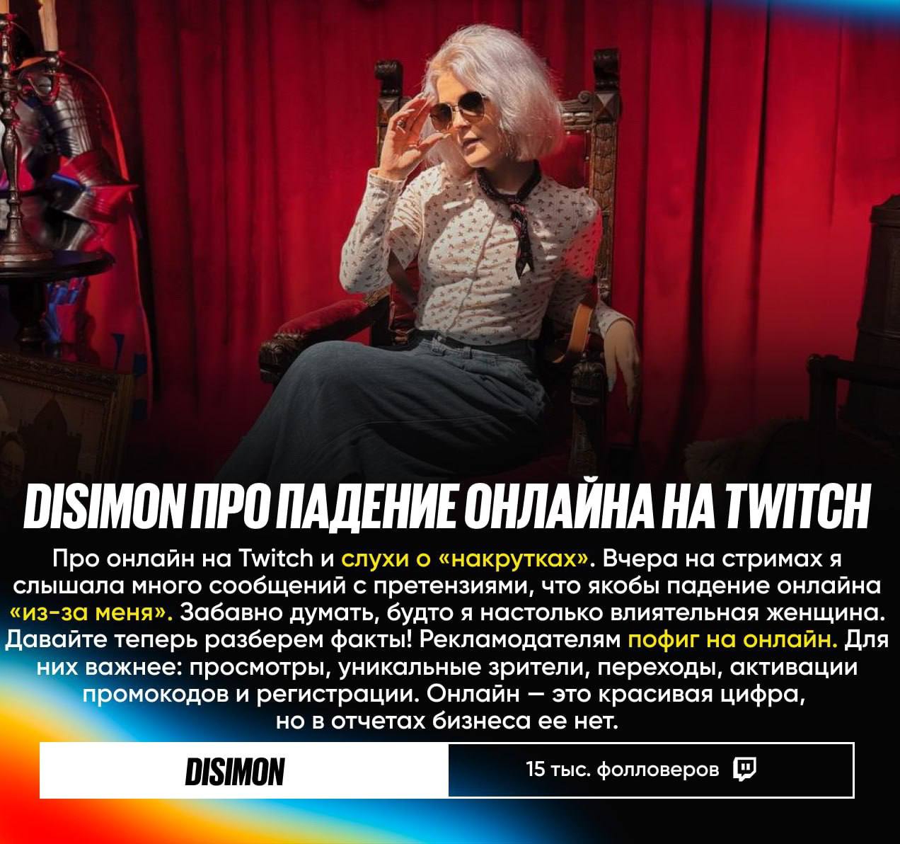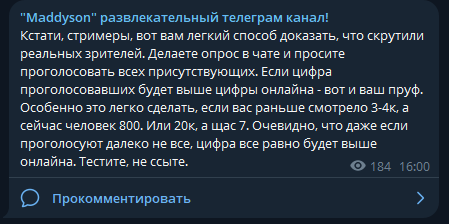 Кстати, стримеры, вот вам легкий способ доказать, что скрутили реальных зрителей. Делаете опрос в чате и просите проголосовать всех присутствующих. Если цифра проголосовавших будет выше цифры онлайна - вот и ваш пруф. Особенно это легко сделать, если вас раньше смотрело 3-4к, а сейчас человек 800. Или 20к, а щас 7. Очевидно, что даже если проголосуют далеко не все, цифра все равно будет выше онлайна. Тестите, не ссыте.