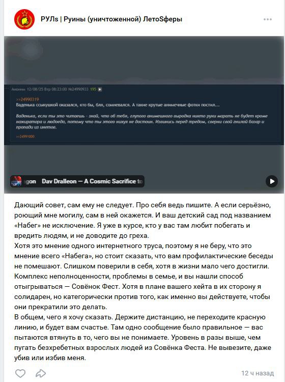 •Причем здесь мы? В первый раз кто-то из анонов с есача приходил к нам в тред и просил покарать Блядю в ответ ему было сказано "не твоя личная" и никто собственно не обратил внимание на данную проблему. Второй раз был недавно и аноны заинтересовались что там вообще творится на что Блядя выкатил шизовысер: ".. если набегаторы станут защищать помоечные группы то будут отвечать перед ФСБ, не детским миром и Спортлото". Аноны восприняли угрозу буквально.